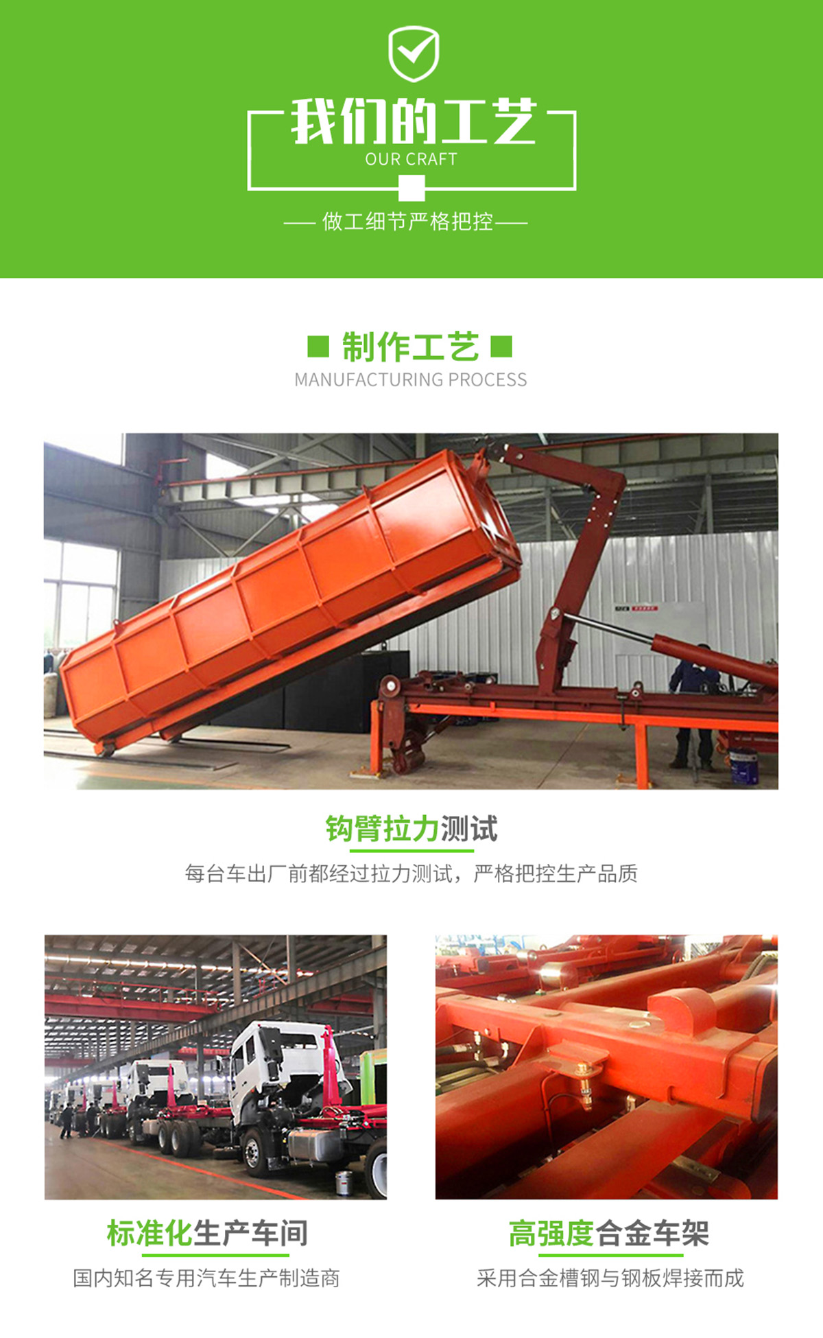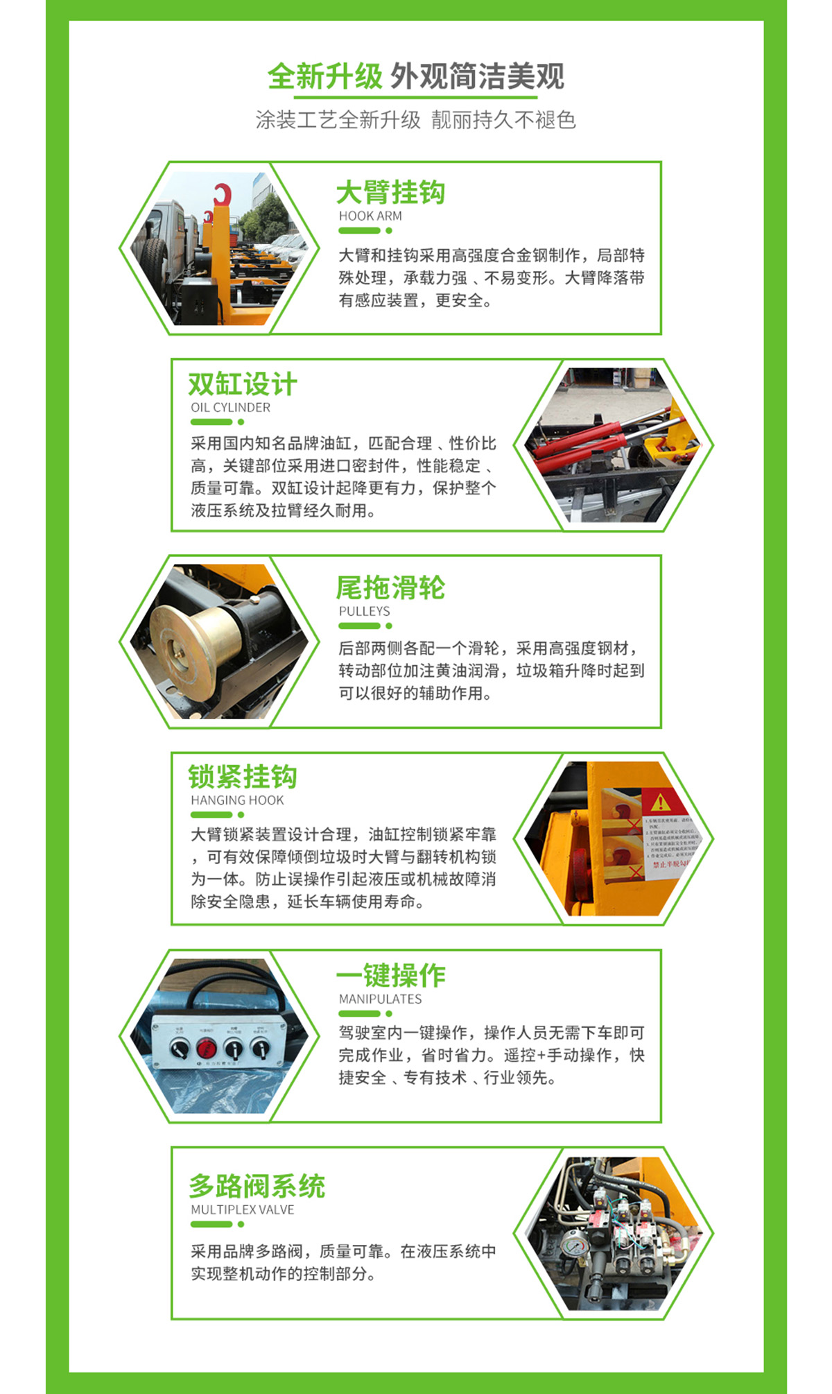 上裝配置:配套12~14方勾臂垃圾箱,主勾臂由高強度板材制作,雙油缸,國產多路閥,液壓油泵,標配駕駛室外部操作,可選裝駕駛室室內操作,選裝液壓后支腿,防誤操作,帶平衡閥,液壓鎖。